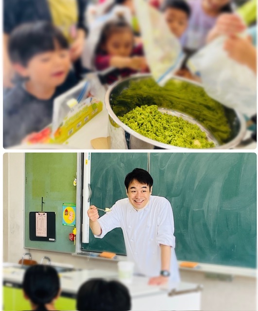 種まきを一緒に行い、栽培した津久井在来種の枝豆を使い、6年生と4,5歳児が合同調理実習を行う前に、シチリアレストラン「フィーコディンディア」の横井シェフがプロの技を教えに来てくれました。