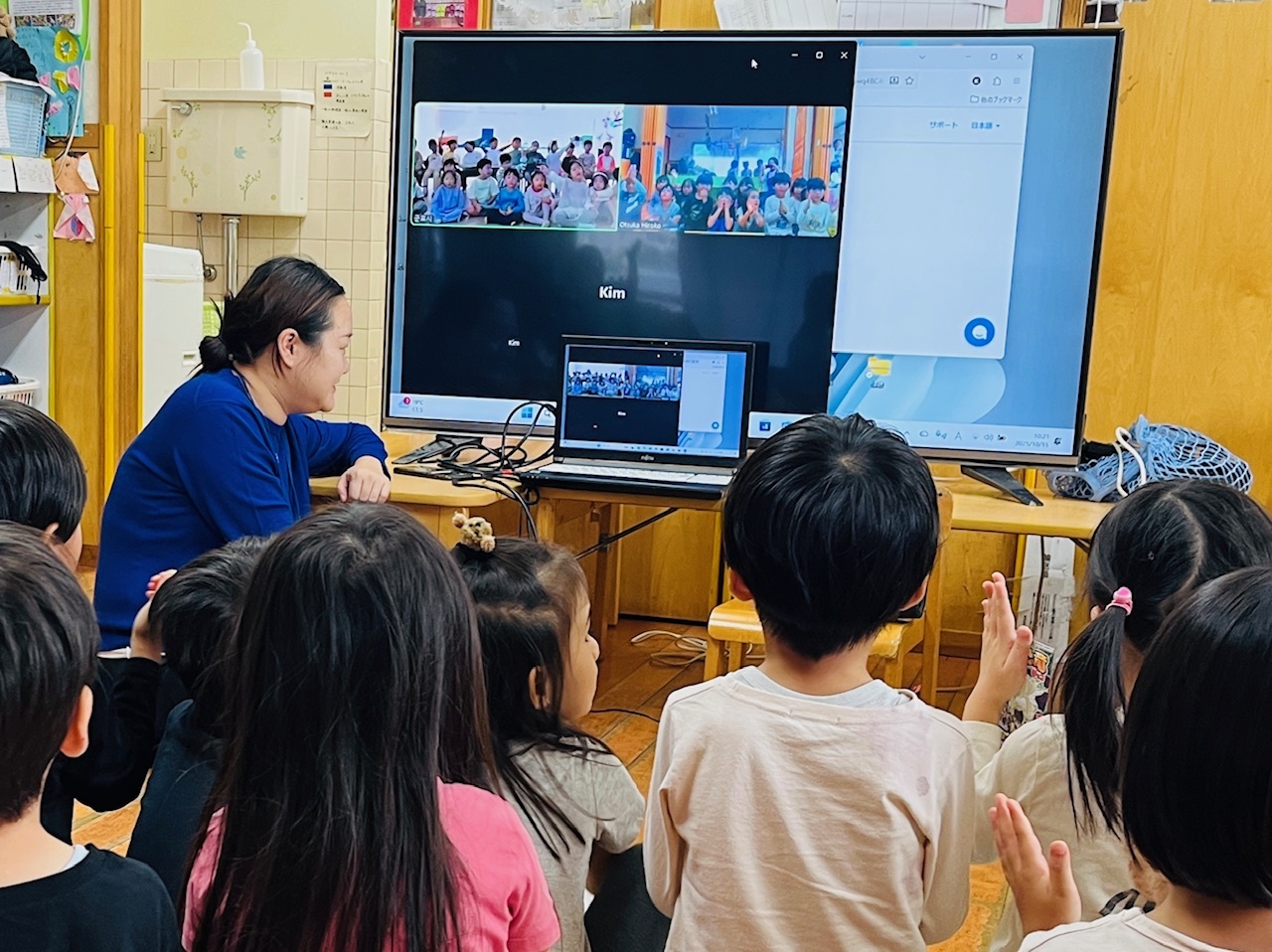 ニュージーランドの子どもたちとのオンライン交流。今回は先方の保育園が感染症の流行で休園になり、急遽、コーディネーターのリタさんと、こなかっこたちの交流になりました。