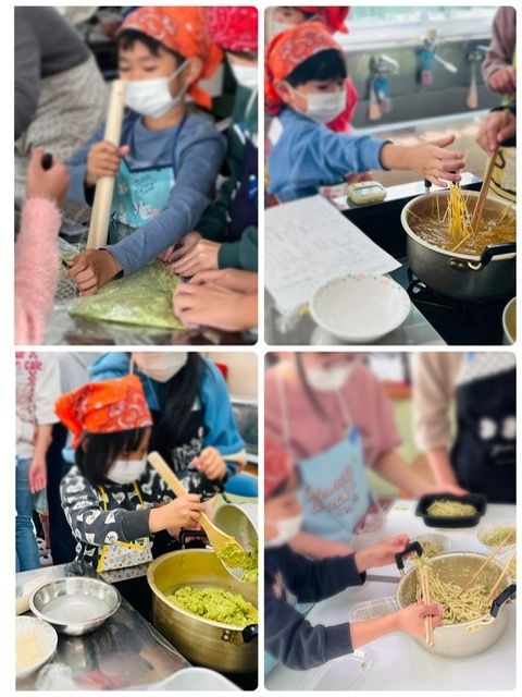 10月20日の準備でプロの技術を学び、11月19日の授業で当日のシミュレーションを行った6年生と4,5歳児たちは、自分たちの力で枝豆パスタを作りました!