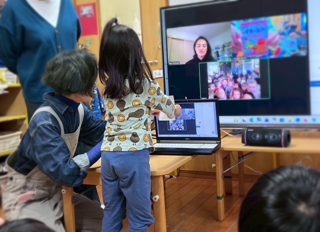 ニュージーランドの子どもたちとのオンライン交流。今回は先方の保育園が感染症の流行で休園になり、急遽、コーディネーターのリタさんと、こなかっこたちの交流になりました。