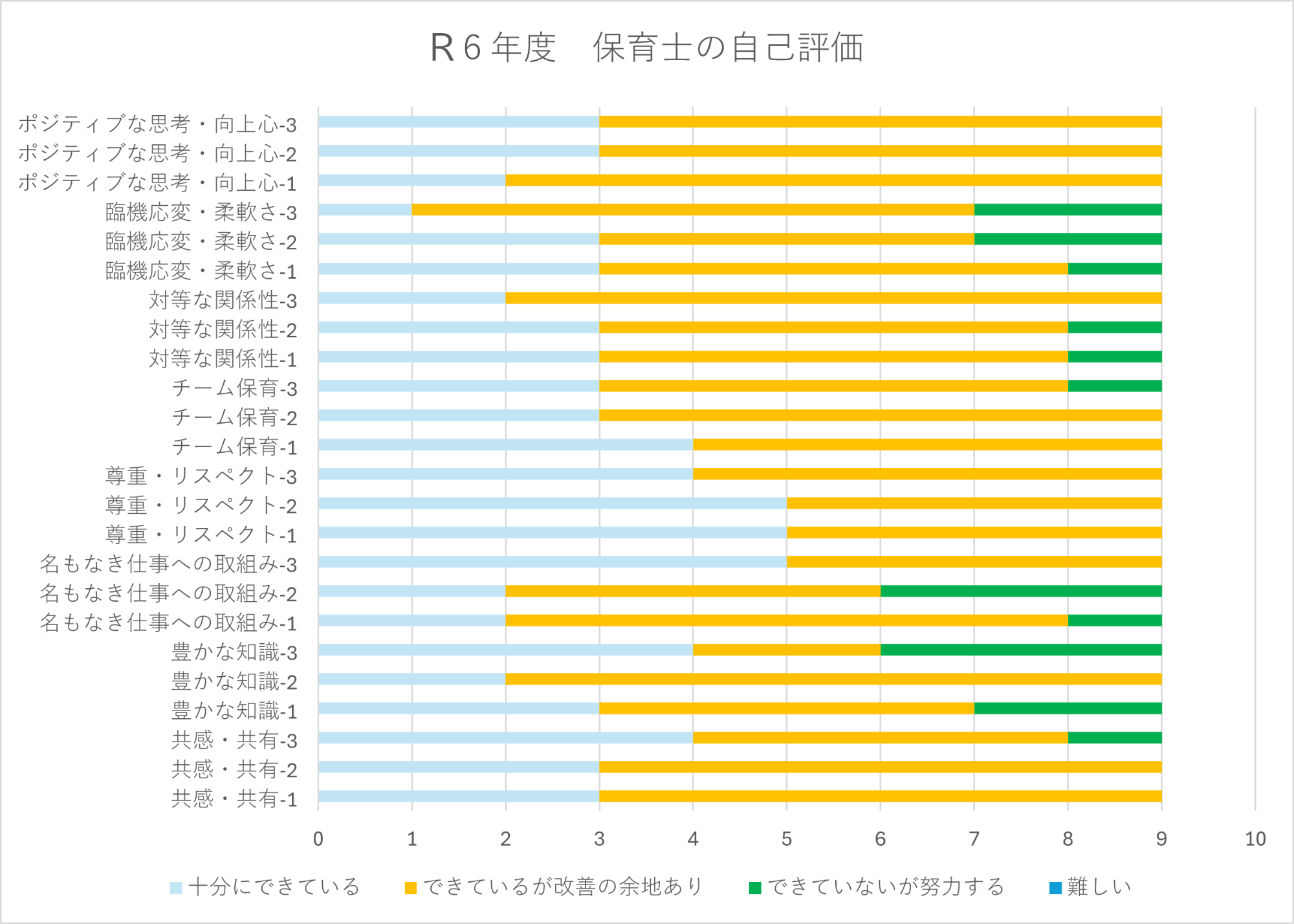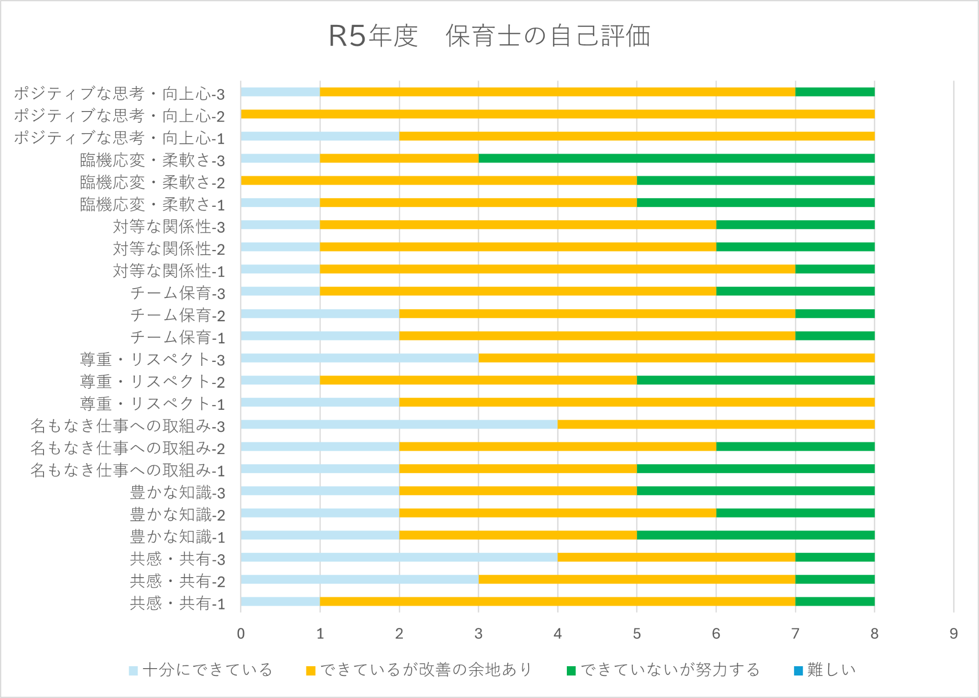 子中保育園における保育者の自己評価指標です。各評価項目に対して、(A)十分にできている、(B)できているが努力余地あり、(C)できていないが努力する、(D)難しい(要育成)の4段階で評価を行っています。評価指標も、2021年に、当園の保育者全員で”理想の同僚”をイメージしながら作成しました。